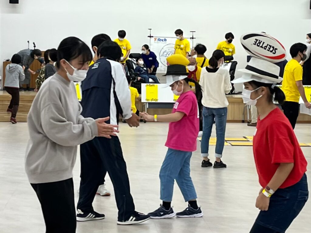 中折れハットをかぶり、その上にラグビーボールを乗せて歩く競技。ボールを落とさないよう慎重に、でも楽しくゴールを目指す子どもたちの姿に、会場は大きな盛り上がりを見せました。