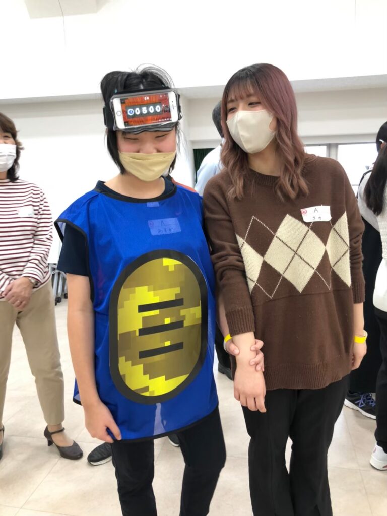 参加者は大きな小判の付いたビブスと、スマートフォンをセットしたヘッドバンドを装着。4人の忍者は「ニンニン」、お殿様役は「くせもの〜」と言いながら、相手チームの小判にスマホを向け、反応すると「チャリン」という音が鳴る仕組みです。テンポよく音が鳴り、子どもも大人も夢中になって楽しみました。