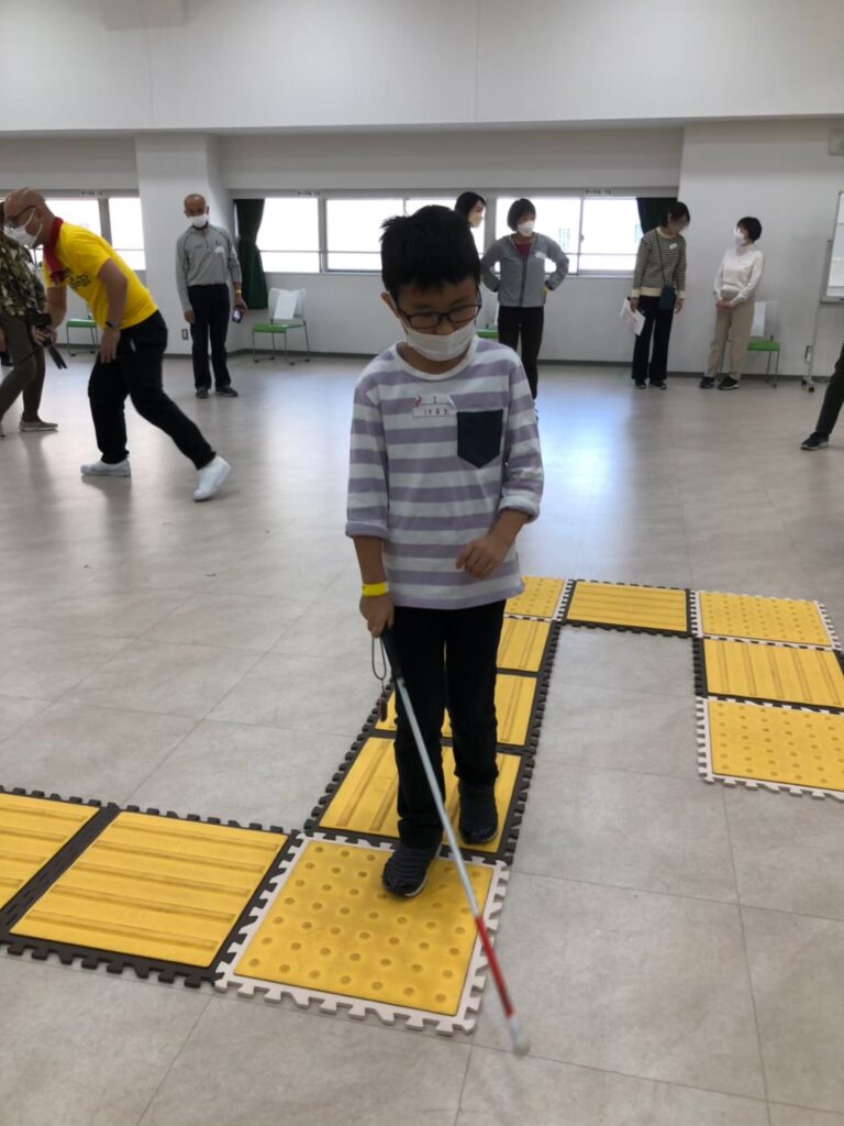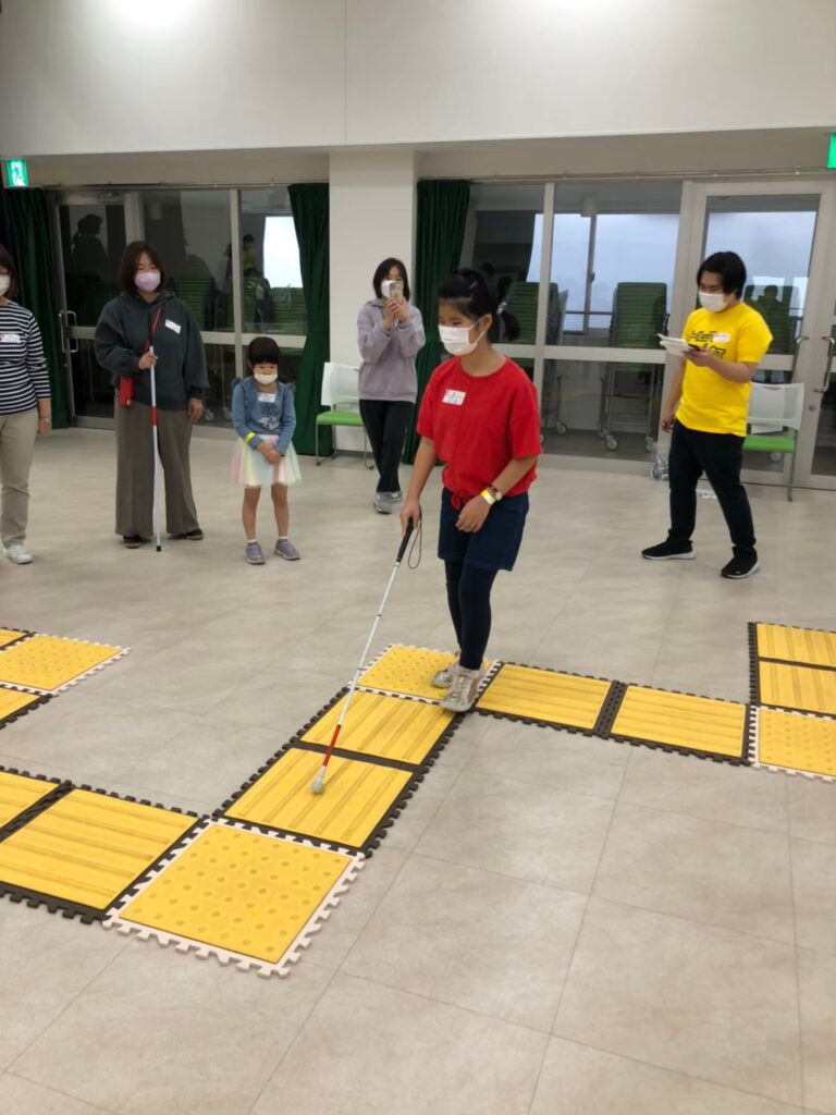 2種類の点字ブロックを使い、チームごとに相手チームが歩くコースを作成。そのコースを白杖を頼りにリレー形式で進む競技です。見え方の違いを超えて協力し合う姿が印象的でした。